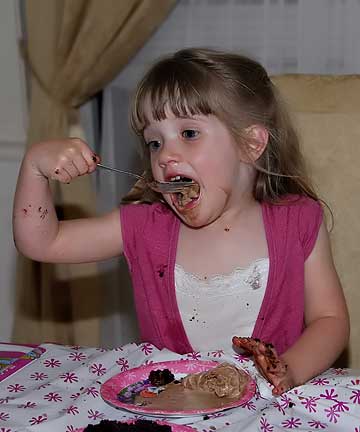 As soon as Mom put out the birthday decorations, I had to "fix" the cups into a line. Mom should know things don't need stacked around here. This year I was very much into my cake and icecream! I even used a fork! I also liked wearing the birthday hats and said "yee haw" every time I put one on. I guess I was a little rough putting the hats on because they kept collapsing.